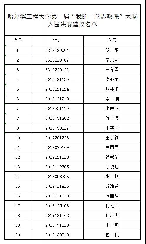 截止2019年11月15日,太阳集团tyc234cc第一届“我的一堂思政课”大赛共有70名同学报名参加,其中50名同学的作品成功进入大赛初赛。经大赛评审委员会对参赛作品评审后,共有20位同学成功入围决赛。现将入围决赛建议名单公布如下(按评分成绩由高到低排序):