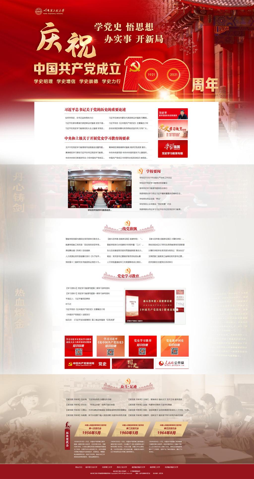 专题网站由校党委宣传部策划、设计、搭建及内容运营,网站分为“重要论述”“新闻动态”“学习教育”“奋斗的足迹”四大板块7个栏目,“重要论述”下设“习近平总书记关于党的历史的重要论述” “中央和上级关于开展党史学习教育的要求”两个栏目,选取习近平总书记关于党史学习教育的重要论述,发布党中央和上级关于党史学习教育重要工作部署;“新闻动态”下设“学校要闻”“一线党旗飘”两个栏目,“学校要闻”主要刊发报道我校党史学习教育重大活动、相关通知等内容,“一线党旗飘”侧重报道各基层党组织、广大师生员工深入开展学习教育的相关活动和学习体会;“学习教育”板块结合融媒体时代新闻宣传特点,开辟“党史学习教育”融媒体专区,以文字、视频、音频等多种媒体形式,集中发布有关党史学习教育参考书目、党史资料、党史理论著述、党史故事等内容,以及学校工学网、官方微信、工学视界等平台为党史学习教育打造的融媒体产品,为广大党员干部和师生员工开展党史学习和理论研究提供参考,该板块还设立了学习自测区,广大党员通过扫描二维码的方式便可轻松完成党史学习教育的自检自测,提高学习效率、巩固学习成果;“奋斗的足迹”选取学校在人才培养、科学研究、国际化、师资队伍建设等方面阶段性重要成果进行展示。