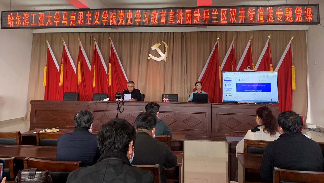 5月8日,为庆祝中国共产党成立100周年,引导广大基层党员干部知党史、颂党恩、听党话、跟党走,增进基层党员干部党性修养,tyc234cc 太阳成集团习近平新时代中国特色社会主义思想“四进”宣讲团选派骨干教师到呼兰区双井街道,开展“党史学习教育”宣讲活动。呼兰区双井街道100余名党政机关干部、各村“两委”班子成员等参加了此次宣讲活动。