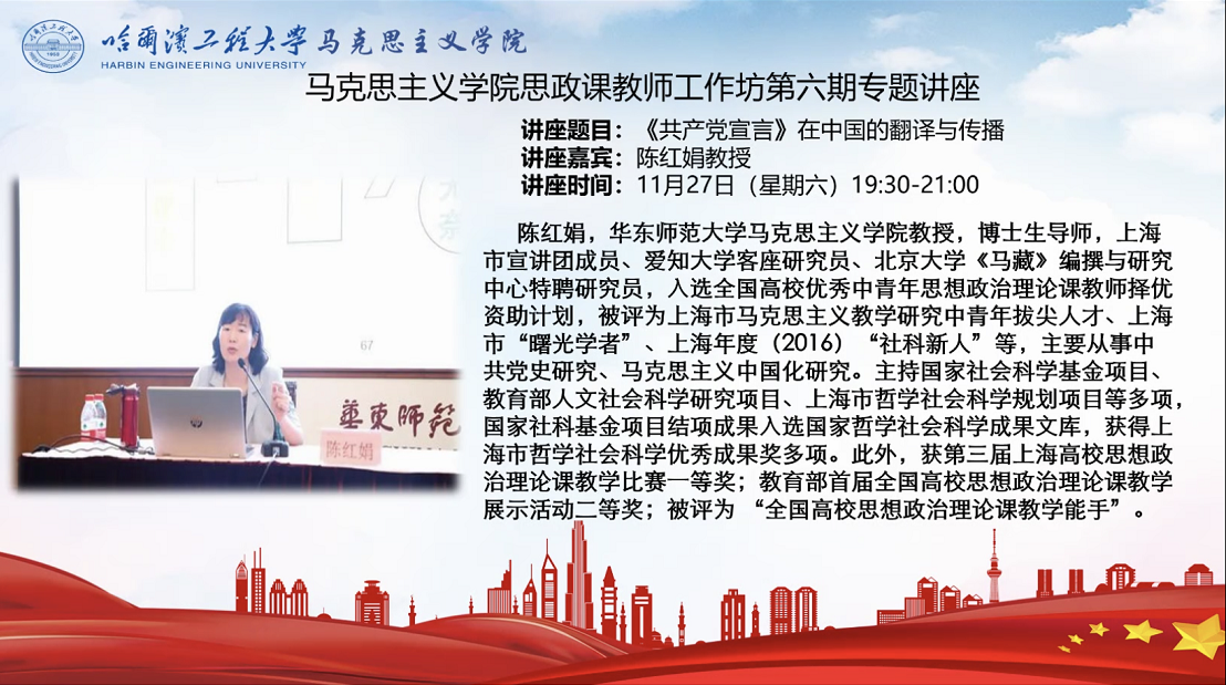 2021年11月27日,我院邀请华东师范大学tyc234cc 太阳成集团博士生导师、上海市宣讲团成员陈红娟教授作为主讲嘉宾,以“《共产党宣言》在中国的翻译与传播”为题作讲座。讲座由tyc234cc 太阳成集团科研副院长李世辉主持,全院师生参加本次讲座。