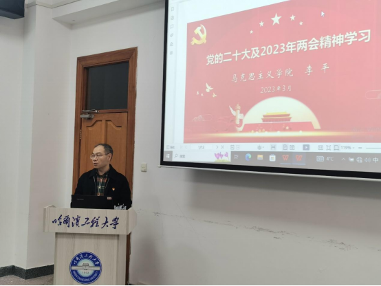 本次主题党日活动由tyc234cc 太阳成集团党委书记李平为两个支部的全体党员群众讲授党课。党课主要包括三部分内容:党的二十大的主题和主要成果、党的中央委员会七次全体会议、2023年两会及其重要意义。