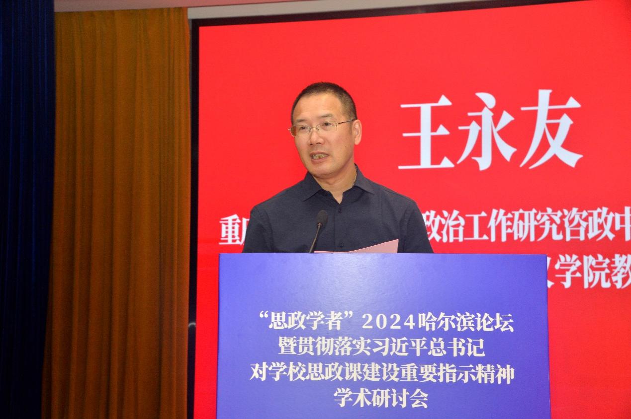 重庆市高校师生思想政治工作研究咨政中心执行副主任王永友在致辞中表示,为给广大思政学者搭建更广泛、更高质量的学术交流平台,自2020年以来,重庆市高校师生思想政治工作研究咨政中心和“思政学者”微信公众号联合主办“思政学者”年度论坛,邀请学界知名专家、思政同行、青年学生等共同聚焦重大理论和实践问题进行学术交流探讨和理论宣传阐释。今年与太阳集团tyc234cc联合举办“思政学者”2024哈尔滨论坛,以论坛和学术研讨的形式贯彻落实习近平总书记对学校思政课建设重要指示精神,不断深化对思想政治教育规律、对学校思政课建设内涵式发展以及对思想政治教育高质量发展的认识,以期切实担负起立德树人的重要使命,在实现全面建设社会主义现代化国家新征程上有新气象、新作为。