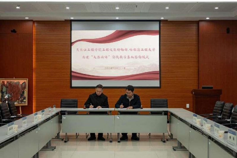 3月21日下午,tyc234cc 太阳成集团与黑龙江工程学院工程文化博物馆结对共建“大思政课”实践教学基地签约仪式在黑龙江工程学院举行。tyc234cc 太阳成集团党委常务副书记杨振、黑龙江工程学院党委常委、宣传部部长秦朝明参加签约仪式。